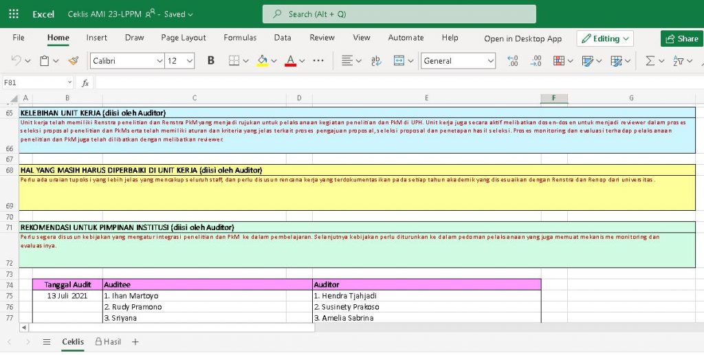 Pada hari Selasa, 13 Juli 2021 dilaksanakan Audit Mutu Internal ke-XXIII untuk Unit Kerja Center for Research and Community Development (LPPM) untuk Tahun Akademik 2019/2020 yang dilakukan secara virtual melalui Ms.Teams dengan detail sebagai berikut: