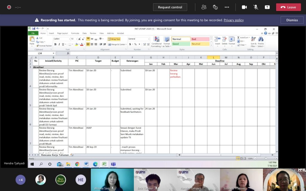 Pada hari Senin, 19 Juli 2021 dilaksanakan Audit Mutu Internal ke-XXIII untuk Unit Kerja LP2MP untuk Tahun Akademik 2019/2020 yang dilakukan secara virtual melalui Ms.Teams dengan detail sebagai berikut: