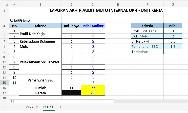 Pada hari Kamis, 22 Juli 2021 dilaksanakan Audit Mutu Internal ke-XXIII untuk Unit Kerja Facility and General Affairs untuk Tahun Akademik 2019/2020 yang dilakukan secara virtual melalui Ms.Teams dengan detail sebagai berikut: