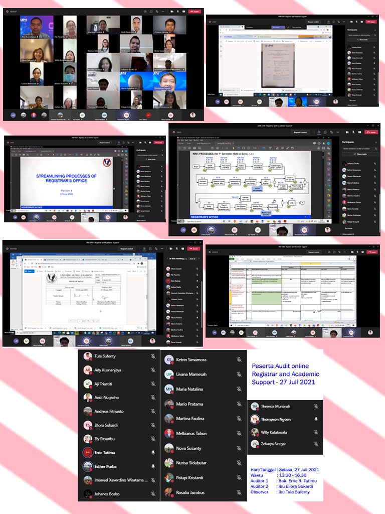 Pada hari Selasa, 27 Juli 2021 dilaksanakan Audit Mutu Internal ke-XXIII untuk Unit Kerja Registrar and Academic Support untuk Tahun Akademik 2019/2020 yang dilakukan secara virtual melalui Ms.Teams dengan detail sebagai berikut: