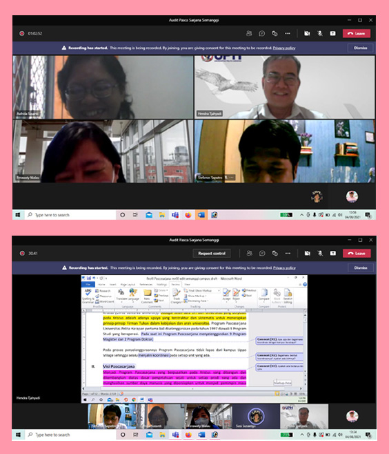 Pada hari Rabu, 04 Agustus 2021 dilaksanakan Audit Mutu Internal ke-XXIII untuk Unit Kerja Pasca Sarjana Semanggi untuk Tahun Akademik 2019/2020 yang dilakukan secara virtual melalui Ms.Teams dengan detail sebagai berikut: