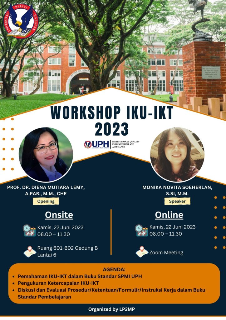 Dalam rangka untuk memahami buku standar yang telah dimutakhirkan, LP2MP mengundang seluruh pimpinan fakultas, prodi beserta Quality Taskforce dan Quality Officer di Universitas Pelita Harapan kampus Lippo Village untuk mengikuti Workshop IKU-IKT yang akan diselenggarakan secara onsite pada: